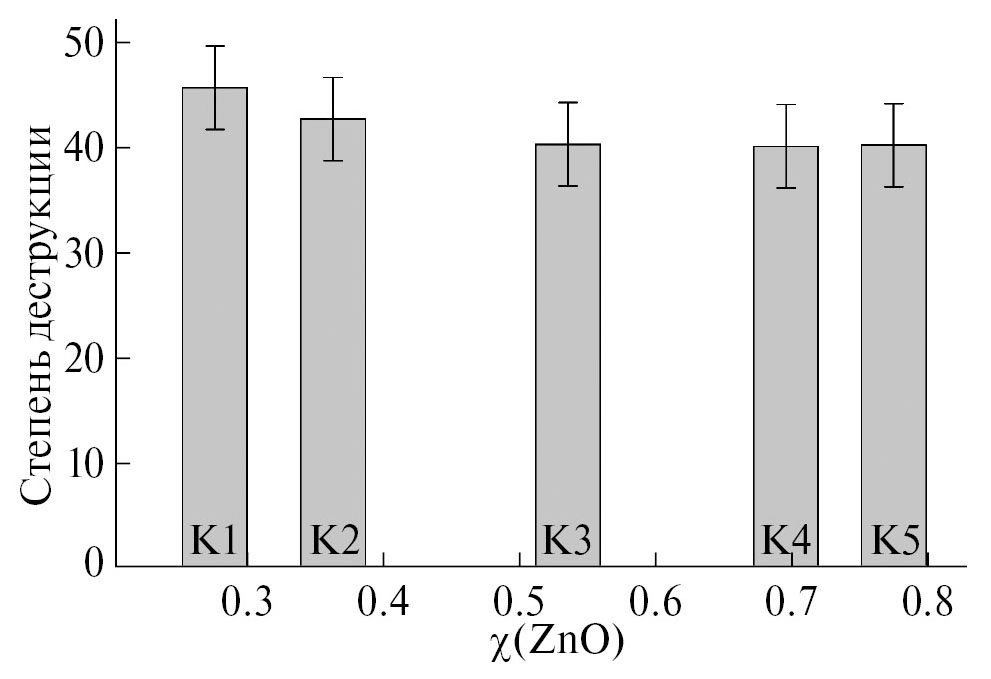 Зависимость фотокаталитической активности (τ = 1 ч) композита NiFe2O4/ZnO от его состава представлена на рис. 9. Незначительное снижение степени деструкции при переходе от образца К1 к К2 можно объяснить уменьшением количества фазы оксида цинка в композите (от 5.3 до 1.8 мол. %) вследствие внедрения ионов цинка в структуру феррита (табл. 5). Дальнейший рост содержания оксида цинка до 61.1 мол. % в пределах ошибки не сказывается на степени деструкции кристаллического фиолетового. При этом при использовании чистофазного оксида цинка за 1 ч в условиях эксперимента краситель разлагается на 80%. Мы предполагаем, что отсутствие зависимости каталитической активности композитов NiFe2O4/ZnO от содержания в них ZnO (1.8–61.1 мол. %) может быть связано с изменением поверхностных свойств гибридного материала в ходе его прокаливания и требует дополнительного изучения.
