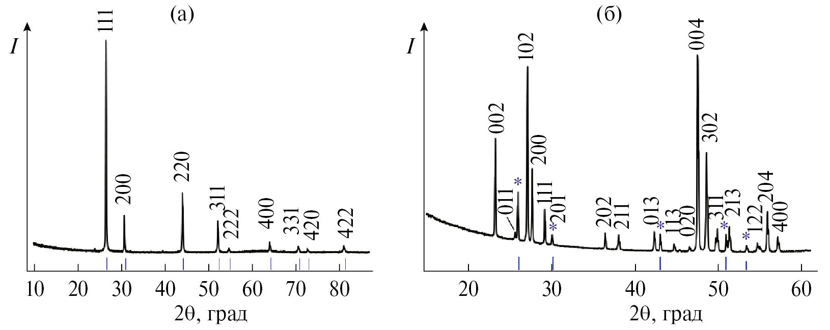 Рис. 2. Рентгенограммы кристаллов SrF2 (а) и PbF2 (б), синтезированных в результате взаимодействия в течение 40 мин с газообразным HF на поверхности 0.02 М водных растворов Sr(CH3COO)2 и Pb(CH3COO)2 соответственно. Положения максимумов в нижней части рисунка характеризуют кристаллическую структуру флюорита состава SrF2 [50] (а) и β-PbF2 [51] (б).