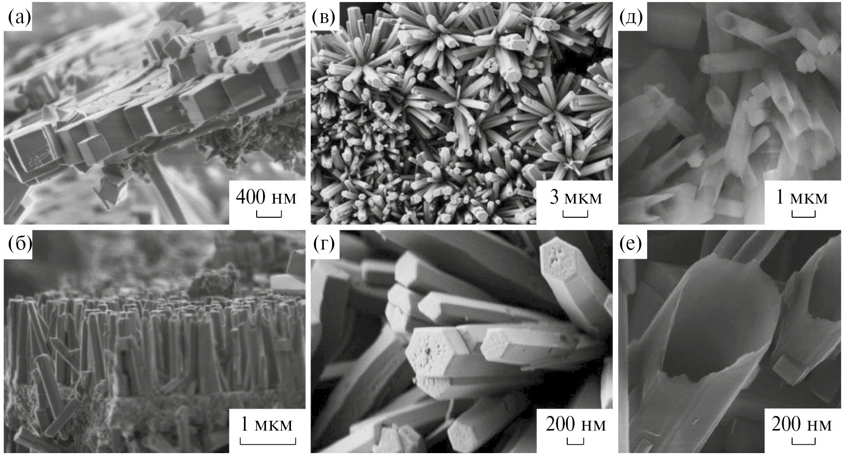При обработке 0.1 М раствора ScCl3 газообразным HF на его поверхности образуется пленка, состоящая из ориентированных кристаллов различной формы: кубической и стержнеобразной. (рис. 4а, 4б). Размер грани кубического кристалла составляет ~600 нм. Длина стержня варьируется от 1 до 3 мкм в зависимости от продолжительности синтеза. При уменьшении концентрации раствора соли скандия до 0.05 моль/л в результате взаимодействия на поверхности образуются структуры с морфологией “ежей”, состоящих из стержнеобразных кристаллов длиной до 10 мкм (рис. 4в). Можно отметить, что в центральной части хорошо ограненных стержней ясно видны поры (рис. 4г). При использовании более кислого 0.02 М раствора Sc(NO3)3 с рН ~ 1 в качестве реагента на поверхности раствора реагента удается получить микроструктуры с морфологией полых шестигранных призм диаметром до 1 мкм и длиной до 5 мкм. Толщина стенок таких трубок не превышает 70 нм. На рис. 4д представлено СЭМ-изображение полых структур, а на рис. 4е — микрофотография, полученная методом HeИМ.