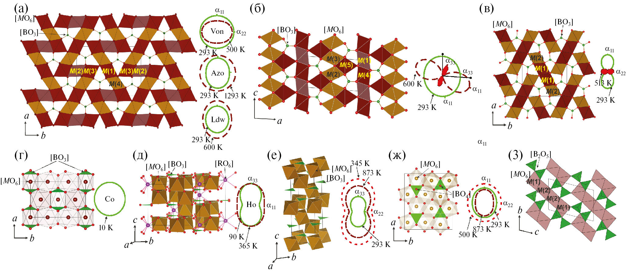 В настоящем разделе кратко изложены результаты термокристаллохимических исследований боратов переходных металлов. Температуры структурных Ts и магнитных фазовых переходов Tord (Нееля TN, Кюри TC или образования спинового стекла Tf) и окисления Tox рассматриваемых боратов, по данным разных методов, представлены в табл. 1, кристаллохимические характеристики и параметры тензора термического расширения, вычисленные по данным порошковой и монокристальной терморентгенографии – в табл. 2. Также в табл. 2 приведена количественная оценка анизотропии термического расширения Ämax из работы [28] – степень анизотропии плоскости сечения фигуры тензора расширения с наиболее сильно различающимися значениями ámax и ámin: Ämax = (ámax − ámin)/(ámax + ámin).
