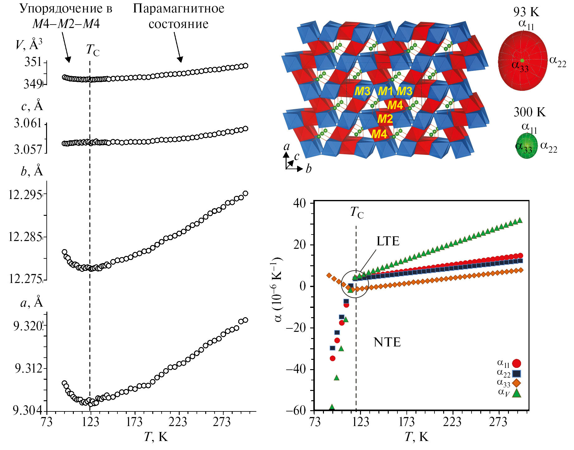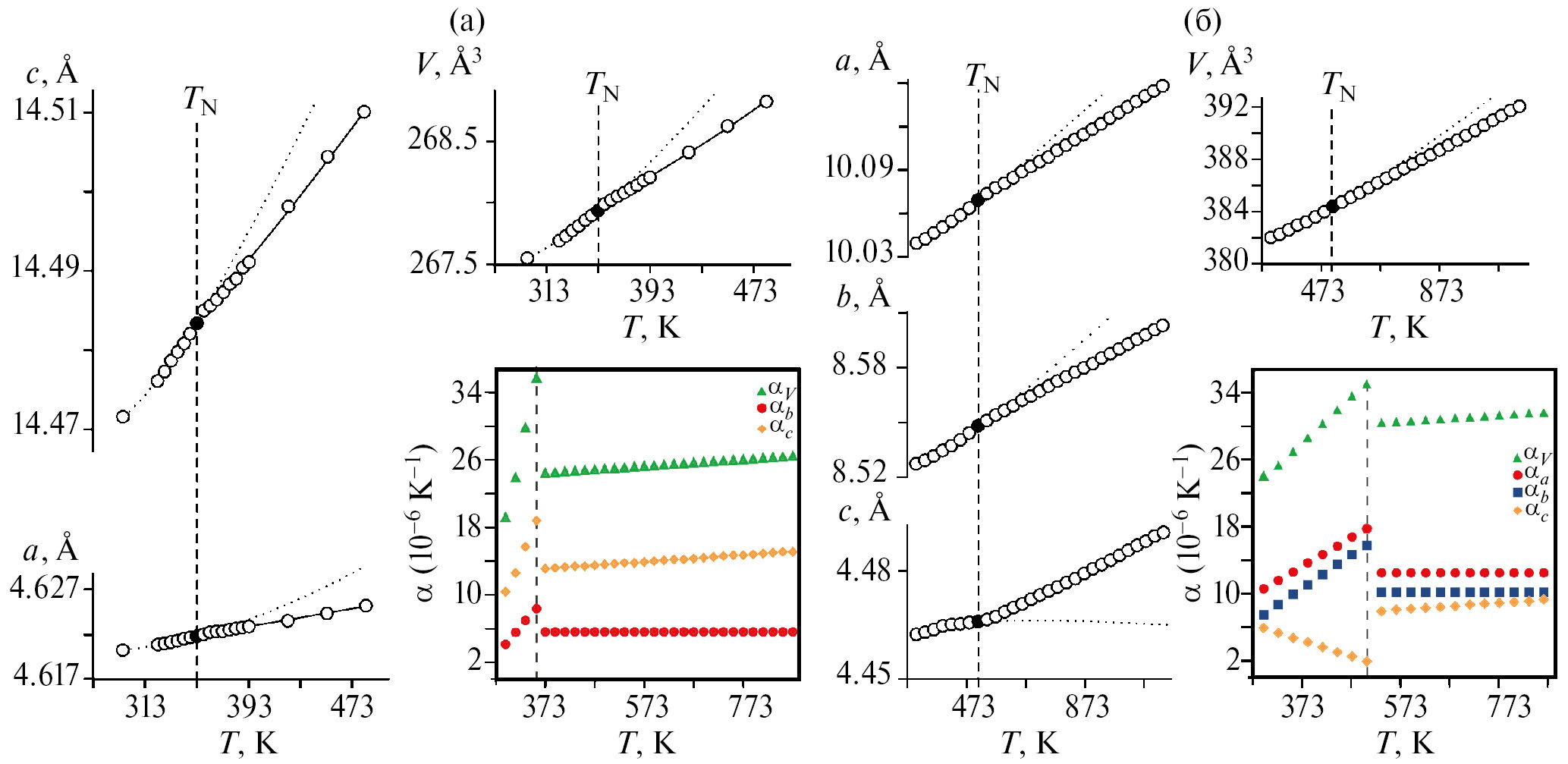 Причинами аномального термического поведения параметров решетки, проявляющегося в перегибах, изломах, термическом затухании, являются магнитные переходы и связанная с ними магнитострикция, а также процессы окисления переходных металлов, сопровождаемые изменением длин связей Mn+–Mn+, Mn+–O и, следовательно, геометрических параметров соответствующих полиэдров. По изменению термической зависимости параметров элементарной ячейки довольно точно оценивается температура магнитного упорядочивания–разупорядочивания Tord, к которой относятся TC и TN.