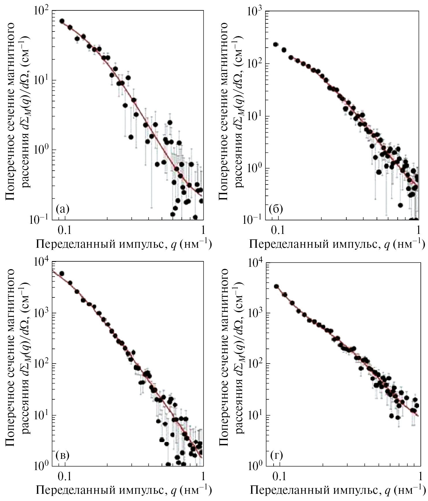Рис. 3. Зависимости магнитного сечения dΣM(q)/dΩ МУРПН при H ~ 0 для оксидов железа: а – γ-Fe2O3 (№ 1); б – γ-Fe2O3–Fe3O4 (№ 2); в – γ-Fe2O3–Fe3O4 @OleicAcid (№ 3); г – Fe3O4–γ-Fe2O3 (№ 4) от q. Сплошные линии − результат подгонки экспериментальных данных по формулам (7) и (9).