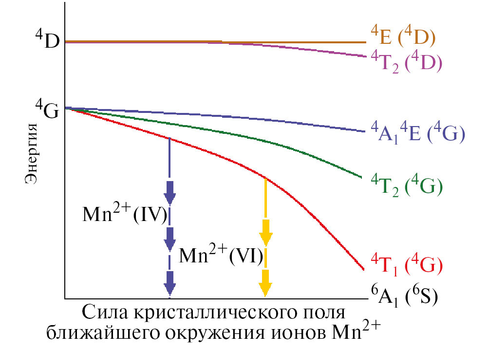 Расщепление электронных уровней Mn2+ под действием кристаллического поля ближайшего окружения определяет особенности спектрально-люминесцентных свойств этих ионов в твердых матрицах. Диаграмма Танабе–Сугано [17] часто используется для описания этого явления в различных матрицах [4, 12, 15–19].