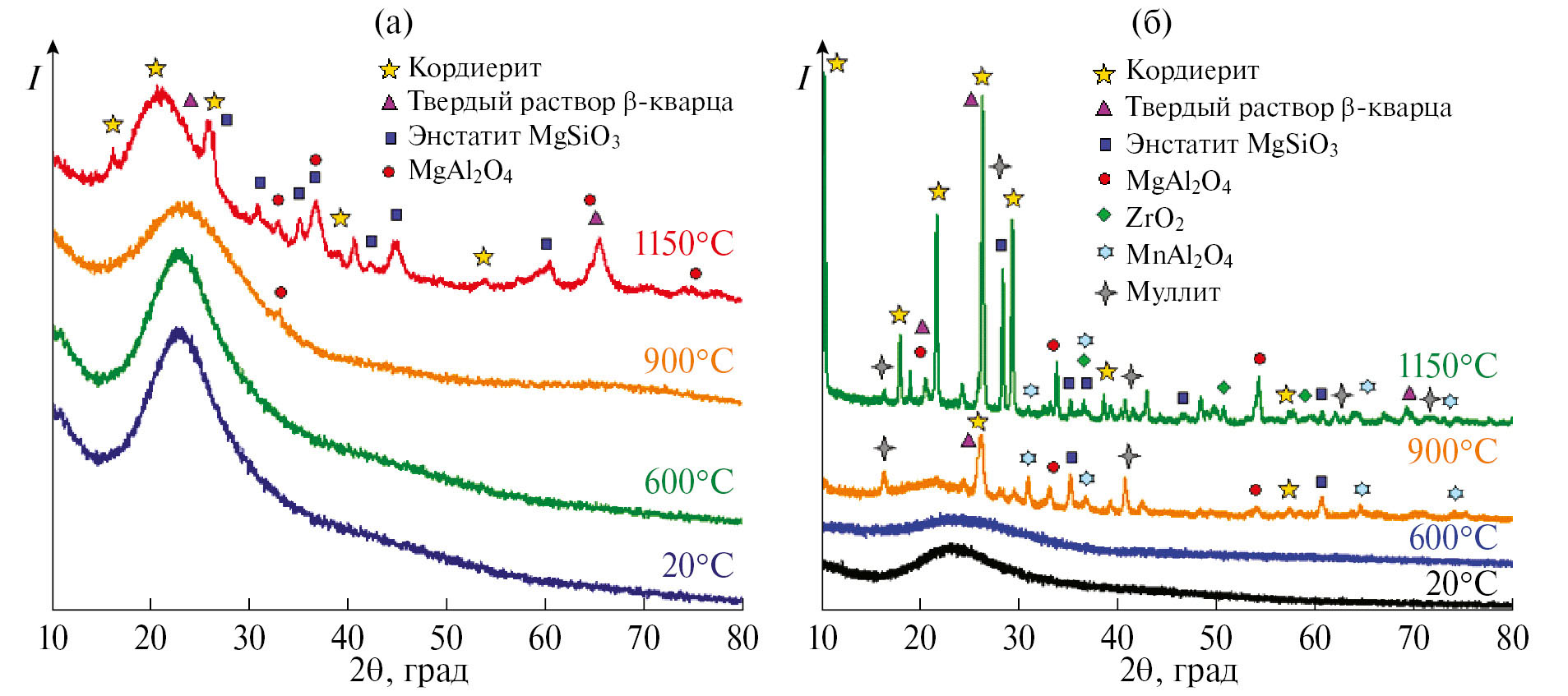 На рис. 2 приведены рентгенограммы образцов, термообработанных при различных температурах. Видно, что исходные гели и порошки, прокаленные при 600оС, являются аморфными. Термообработка при 1150оС приводит к формированию различных кристаллических фаз: кордиерита, энстатита, ZrO2, твердых растворов β-кварца. Известно, что образование этих кристаллов часто наблюдается при кристаллизации стекол системы MgO–Al2O3–ZrO2–SiO2 и формировании ситаллов [3, 32]. Отметим, что характер термической эволюции кристаллической структуры синтезированных золь-гель методом материалов аналогичен изменениям, наблюдаемым при кристаллизации стекол MgO–Al2O3–ZrO2–SiO2, описанным в [32].