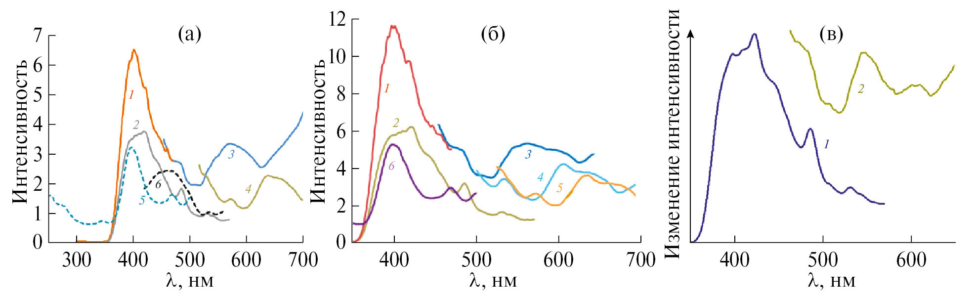 Сопоставление полос эмиссии (рис. 5а, 5б, кривые 1, 2) в синей области спектра (λ = 400–460 нм) с полосами возбуждения люминесценции в желто-красной области спектра (рис. 5а, кривые 5, 6; рис. 5б, кривая 6) показывает их значительное перекрывание. Это позволяет предположить возможность протекания процессов переноса энергии возбуждения между разными люминесцентными центрами или реабсорбции излучения в материале.