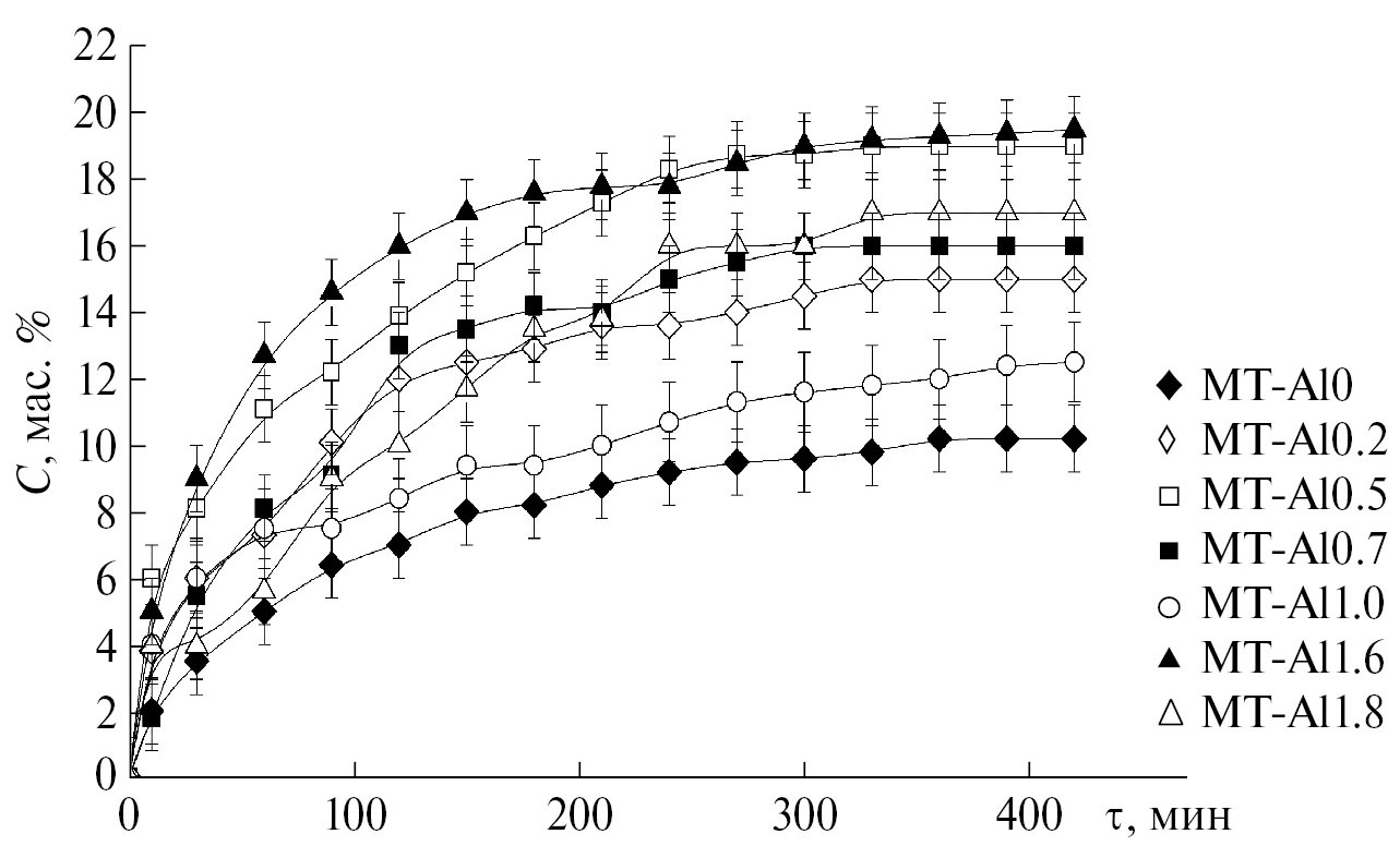 Характер профиля десорбции тиамина гидрохлорида из исследуемых образцов показывает, что все образцы позволяют осуществлять пролонгированный выход лекарственных веществ. Время достижения равновесия составляет в среднем 350–400 мин, что позволяет говорить о возможности разработки эффективных систем для пролонгированного выхода. При этом в зависимости от поставленной задачи, которую необходимо решить с помощью системы доставки лекарственного вещества (ЛВ), например, осуществить пролонгированный выход в желудке или при использовании лекарства, разлагающегося в кислой среде, обеспечить минимальный выход в кислой среде и последующий пролонгированный выход в кишечнике, можно подобрать оптимальный состав носителя. Так, монтмориллониты состава Al0.7 и Al1.0 являются оптимальными носителями ЛВ, обеспечивающими контролируемый пролонгированный выход в кислой среде, для разработки систем пролонгированного выхода ЛВ в среде кишечника оптимальными являются составы Al1.8 и Al1.6.