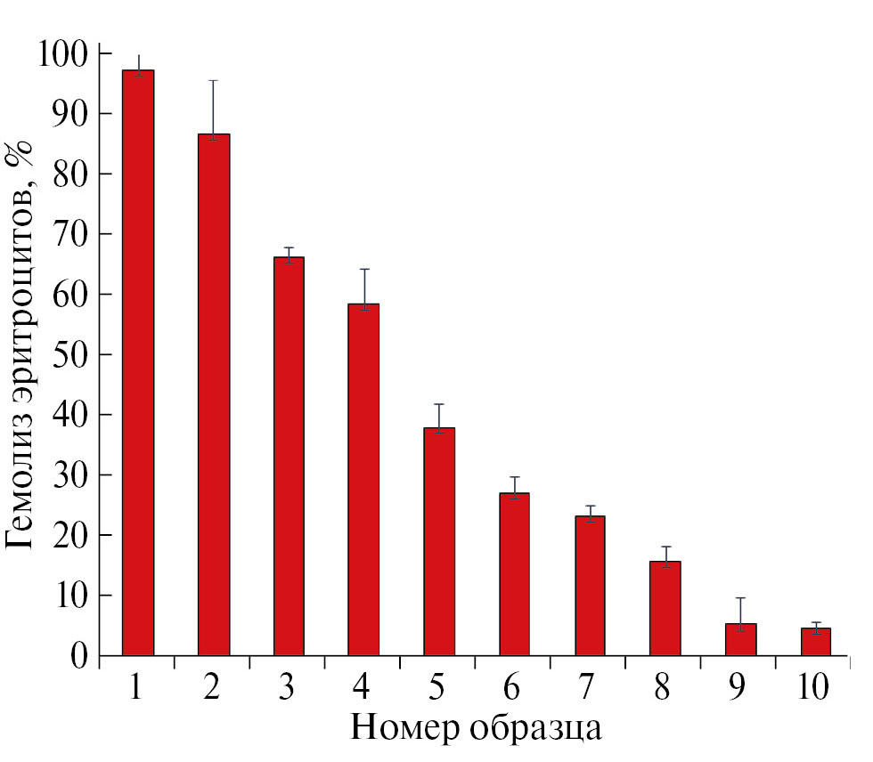 Исследования гемолитической активности в отношении клеток крови и цитотоксичности в отношении эндотелиальных клеток человека Ea.hy926 были выполнены в лаборатории альтернативных антимикробных биопрепаратов научно-образовательного центра “Молекулярные основы взаимодействия микроорганизмов и человека” научного центра мирового уровня “Центр персонализированной медицины” ФГБНУ “ИЭМ” с использованием стандартизированных методик [37]. Для определения способности исследуемых образцов повреждать мембраны эукариотических клеток использовали гемолитический тест [29, 30]. Диапазон исследуемых концентраций составлял от 0.3 до 10 мг/мл.