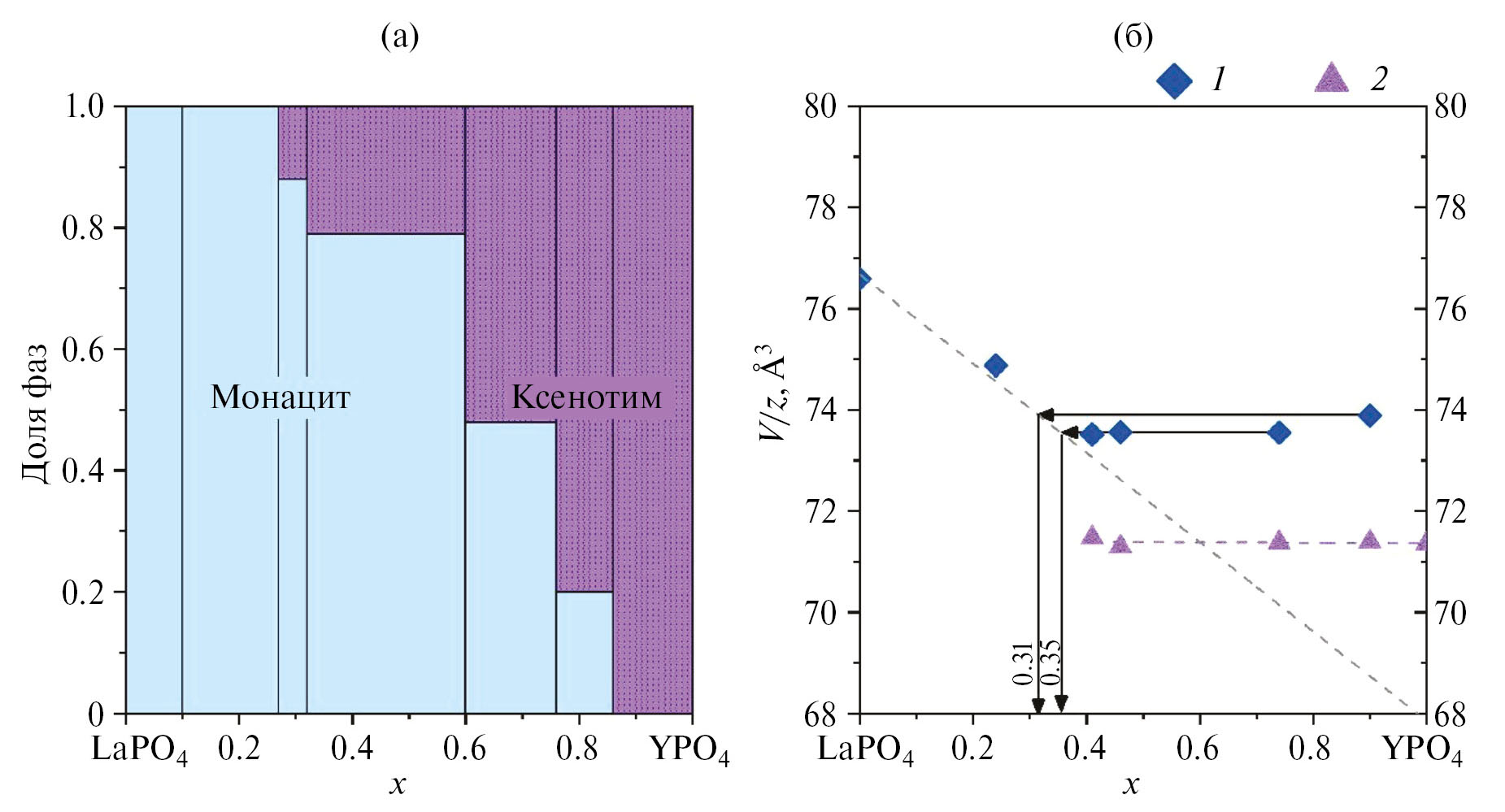 Рис. 5. Соотношение количества фаз в системе LaPO4–YPO4 после отжига при 1400°С в течение 2 сут в зависимости от содержания YPO4 (x, мол. д.) в системе (а) и зависимость объема элементарной ячейки, отнесенного к одной формульной единице структуры (V/z), от содержания YPO4 (x, мол. д.) в системе для структур: 1 – монацита, 2 – ксенотима (б).