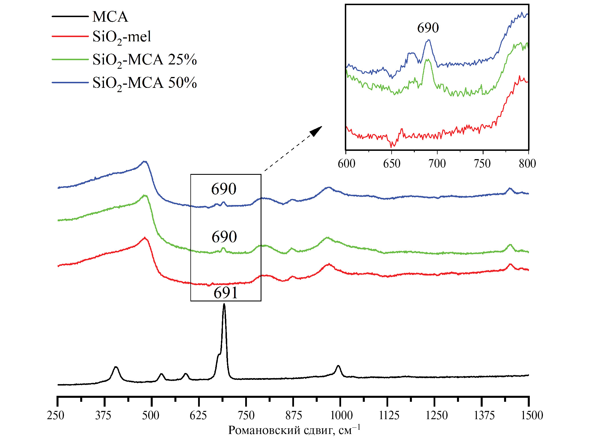 Рис. 5. КР-спектры MCA, SiO2-mel, SiO2-MCA 25% и SiO2-MCA 50%.