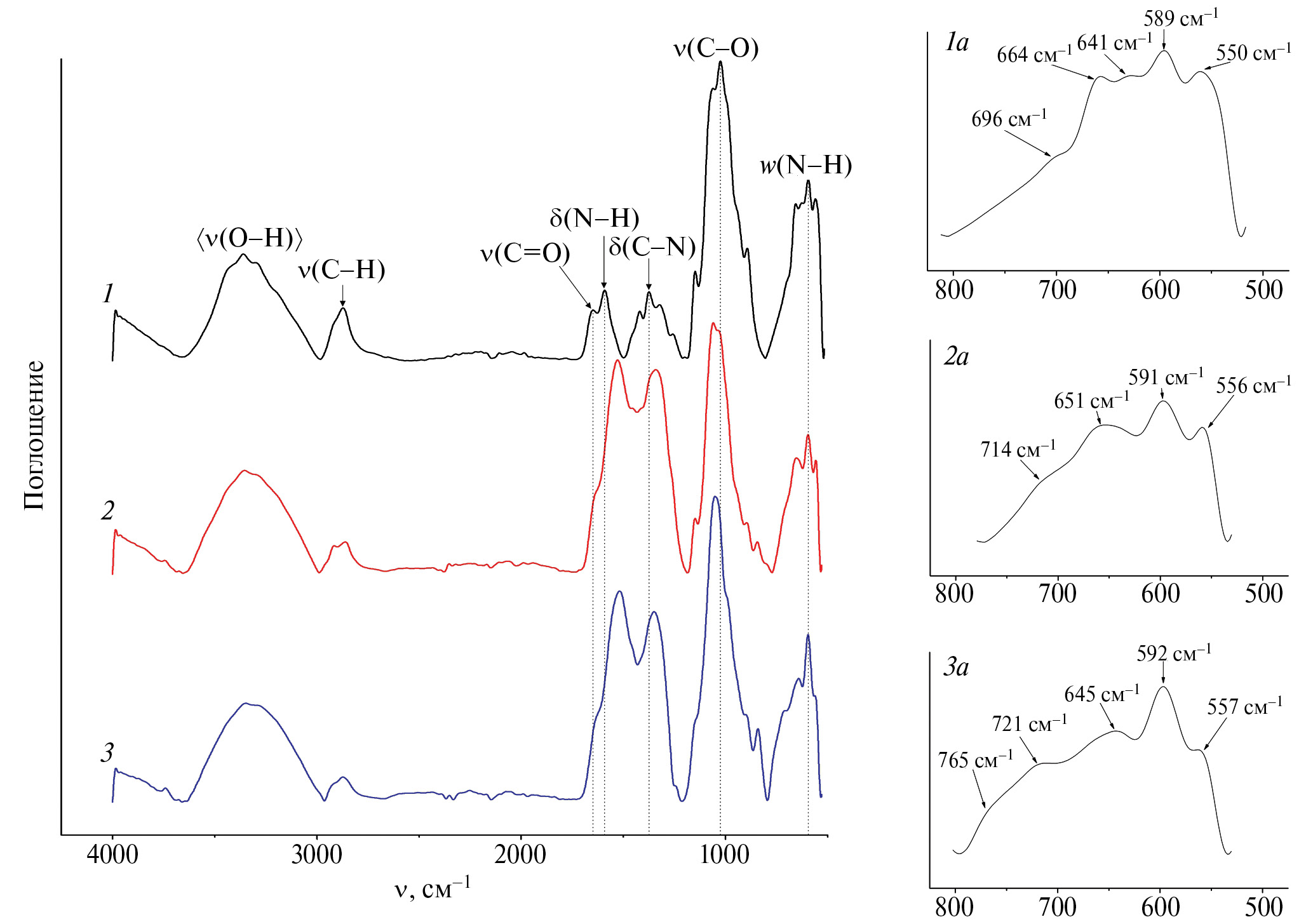 Рис. 1. ИК-Фурье-спектры поглощения в широком диапазоне и в области 500–800 см–1: ХТЗ (1, 1а), композитов Ce_3_Chit (2, 2а) и Ce_4_Chit (3, 3а).