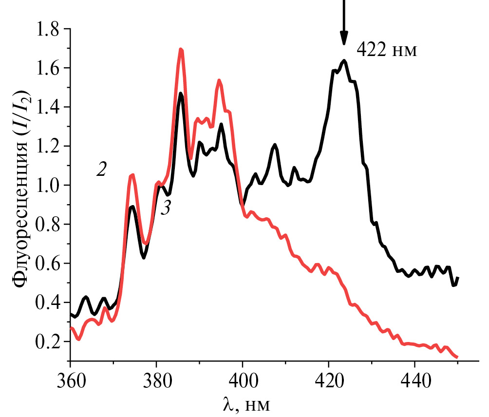 Спектры флуоресценции образцов получены на спектрофлуориметре Agilent Cary Eclipse с использованием стандартных одноразовых пластиковых кювет с длиной хода луча 1 см (пропускание от 260 нм). Полученные спектры флуоресценции для удобства анализа нормировали по второй колебательной полосе спектра флуоресценции пирена.
