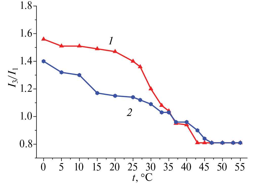 Из температурной зависимости интенсивности присутствующего в некоторых образцах эксимера можно судить о том, что с повышением температуры в образце становится все больше пирена в свободном состоянии (рис. 6). На отметке 50оС для всех образцов зафиксированы минимальные значения I3 к I1 при максимальном значении Iex. При повторном охлаждении вся система возвращается в исходное равновесное состояние, поэтому с уверенностью можно говорить о том, что процесс разрушения комплексов вследствие изменения температуры является обратимым.