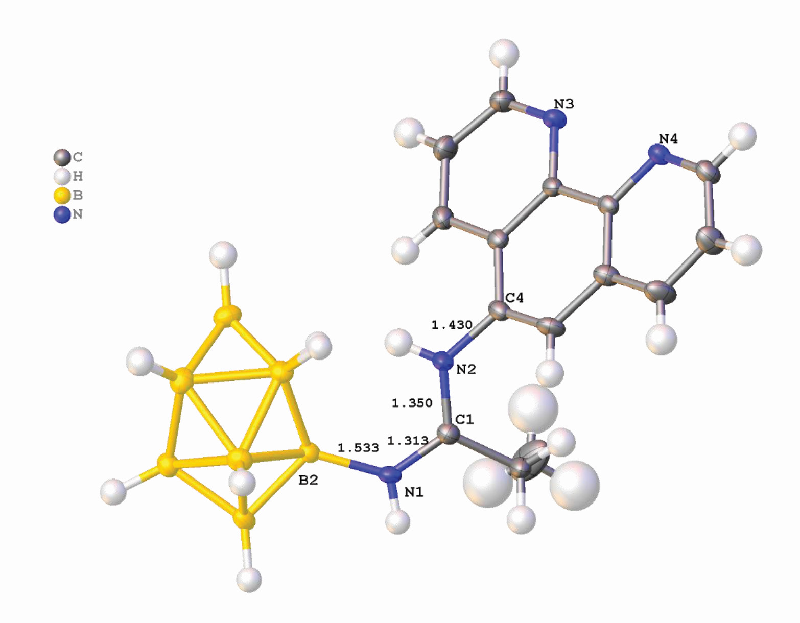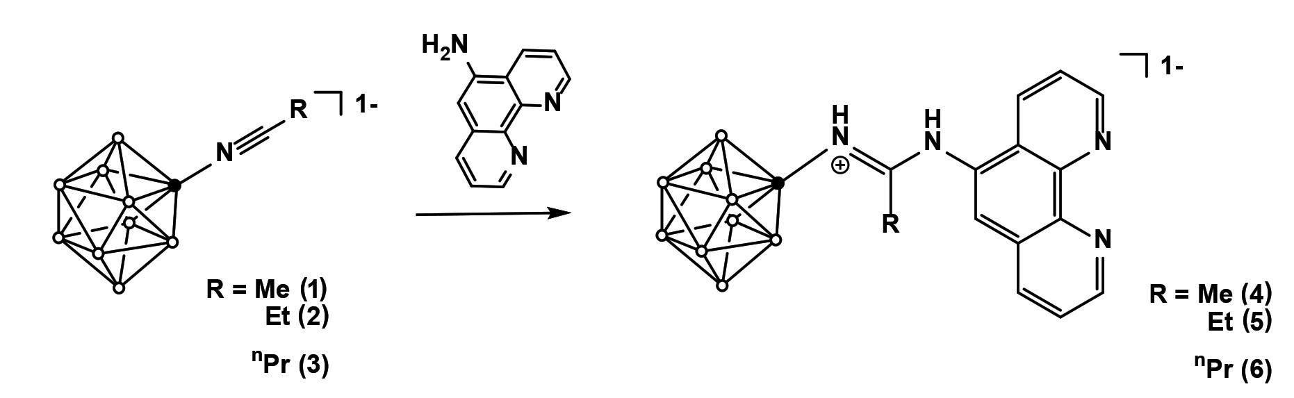 Таким образом, в работе изучен процесс нуклеофильного присоединения 1,10-фенантролин-5-амина к нитрилиевым производным клозо-декаборатного аниона и предложен эффективный метод получения замещенных производных амидинового типа, содержащих эффективную хелатирующую группу.