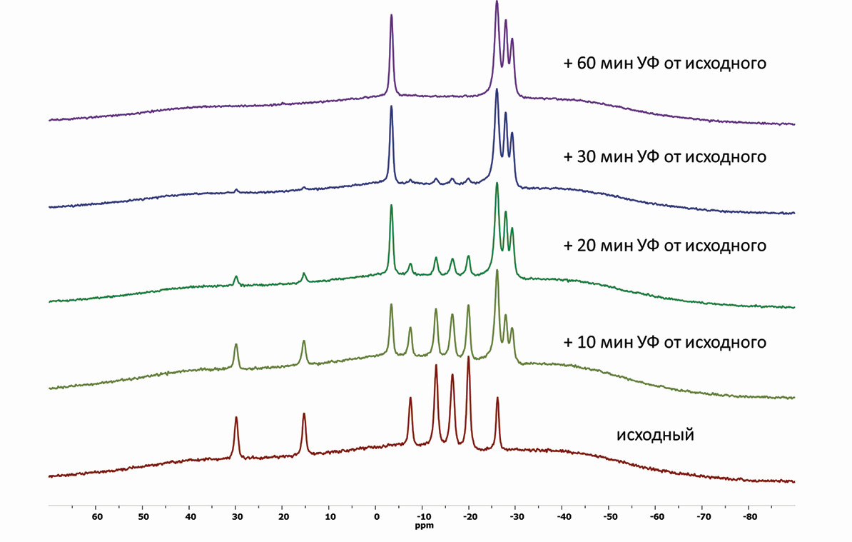 УФ-эксперименты. Исследование времени протекания процесса перегруппировки аниона [транс-B20H18]2– → [изо-B20H18]2– под действием УФ-облучения проводили с помощью 11В ЯМР-спектроскопии с использованием кварцевой ампулы Wilmad 507-TR-7 (диаметр 5 мм, толщина 0.38 мм) с интервалом времени: 0, 10, 20, 30, 60, 90, 120, 180 мин. В качестве источника УФ-излучения использовали лампу Camelion LH 26-FS/BLB/E27 (мощность 26 Вт, длина волны 365 нм), помещенную в обернутую фольгой емкость с ЯМР-ампулой. В качестве исследуемых образцов использовали соль (Ph4P)2[B20H18] (15 мг) в 0.5 мл соответствующего растворителя (CH3CN, ДМФА или ДМСО).