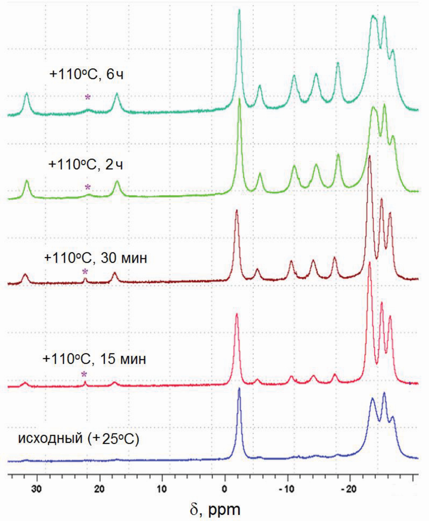 Рис. 1. 11В{1H} ЯМР-спектры реакционного раствора, демонстрирующего процесс перегруппировки аниона [B20H18]2– из транс в изо во времени в CH3CN.