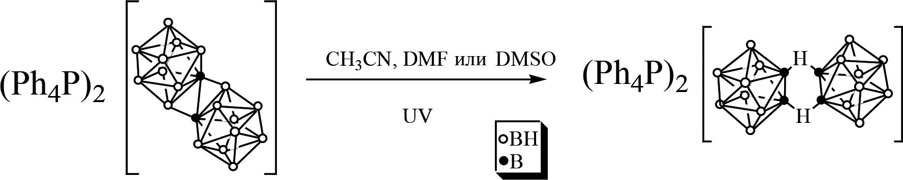 В настоящей работе изучен процесс перегруппировки Хоторна макрополиэдрического аниона [транс-B20H18]2– → [изо-B20H18]2– в органических растворителях (ацетонитрил, ДМФA, ДМСО), который протекает согласно схеме 1.