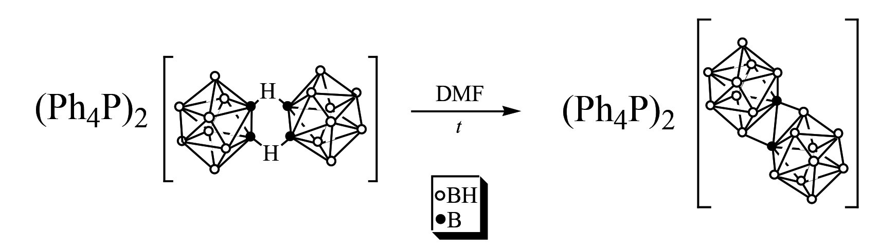 Во второй части работы изучен процесс обратного перехода [изо-B20H18]2– → [транс-B20H18]2–, который протекает при повышении температуры в ДМФА (схема 2).