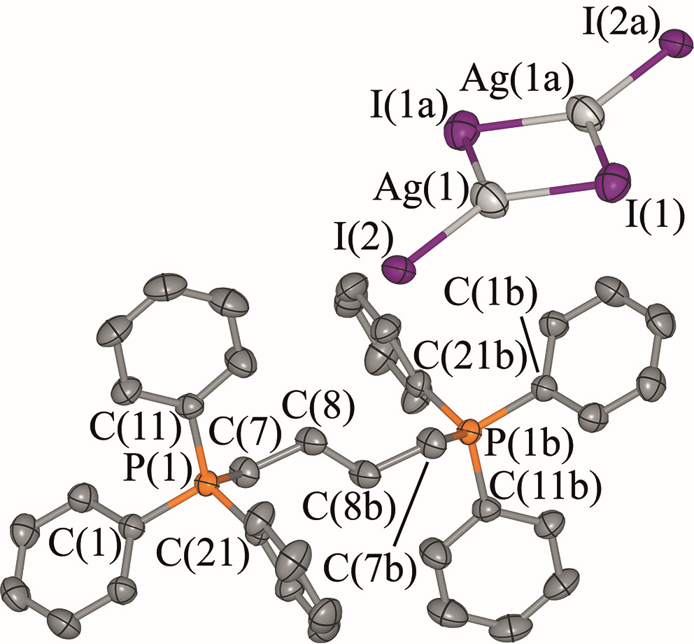 Синтез соединения [Ph3PCH2CH=CHCH2PPh3][Ag2I4] (III). К раствору 50 мг (0.21 ммоль) иодида серебра в 4 мл ДМСО прибавляли при перемешивании 87 мг (0.10 ммоль) дииодида бут-2-ен-1,4-диил-бис(трифенилфосфония) и оставляли реакционную смесь в темноте. После испарения растворителя получили 113 мг (83%) неокрашенных кристаллов III с tпл = 212°С.