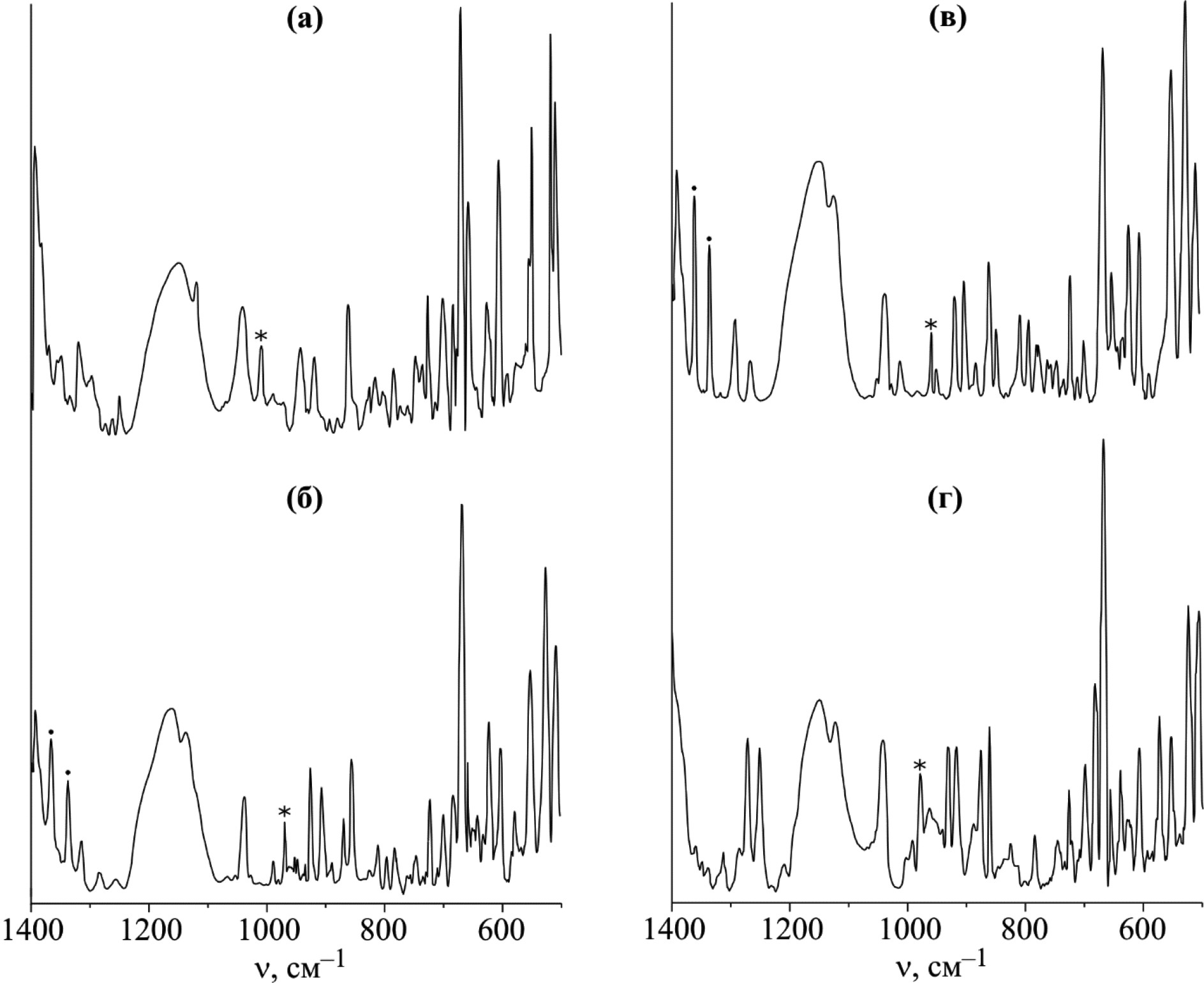 Полезным инструментом для идентификации катион-радикальных форм порфиринов и фталоцианинов является ИК-спектроскопия (рис. 2). Известно, что маркерные полосы для таких соединений находятся в области 1290–1600 см–1 и характеризуют частоты валентных колебаний связей C–C и C–N в пиррольном фрагменте окисленного макроцикла [36, 38, 42, 43, 53, 56, 57, 61]. В ИК-спектре 1/tBuOOH (CtBuOOH = 5.8 × 10–3 моль/л) зафиксированы полосы колебаний связей Cα–Cβ и Cα–N пиррольного фрагмента катион-радикала при 1365 и 1334 см–1, колебаний ν(Ru=O) с частотой 870 см–1 (в катион-радикальной форме C(RuIVPc(tBu)4)2 колебания ν(Ru=O) наблюдаются при 843 см–1 [37]). Фиксируется смещение полосы колебаний ν(Ru=C=Ru) на 39 см–1 в область низких частот (рис. 2б). ИК-спектр водного раствора комплекса 1/tBuOOH (CtBuOOH = 6.4 × 10–2 моль/л) также показал наличие двух сильных полос при 1366 и 1337 см–1, соответствующих частотам валентных колебаний связей Cα–Cβ и Cα–N пиррольного фрагмента катион-радикала каждого фталоцианинового звена в дважды окисленном комплексе (рис. 2в). Образование дикатион-дирадикала контролировали по ЭСП. Также наблюдается присутствие полосы колебаний ν(Ru=O) с частотой 850 см–1, фиксируется низкочастотный сдвиг полосы колебания мостиковой связи ν(Ru=C=Ru) на 50 см–1, которая в исходном димерном комплексе проявляется при 1010 см–1 (рис. 2а, 2в). Смещение полосы колебаний ν(Ru=C=Ru) свидетельствует об изменении положения атома рутения относительно координационной плоскости, вызванное возникновением связи Ru=O в димерном комплексе.