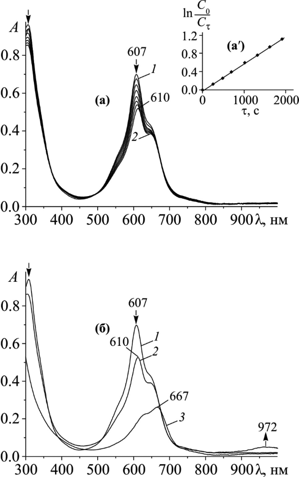 Выдерживание реакционной смеси (при СtBuOOH = = 6.4 × 10–2 моль/л) во времени приводит к гипсохромному смещению Q-полосы при λ = 667 нм на 14 нм и исчезновению полосы в области 850–1000 нм (рис. 1б). Наблюдаемые изменения связаны с восстановлением дикатиона в π-катион-радикал 2′ при окислении им избытка пероксида.