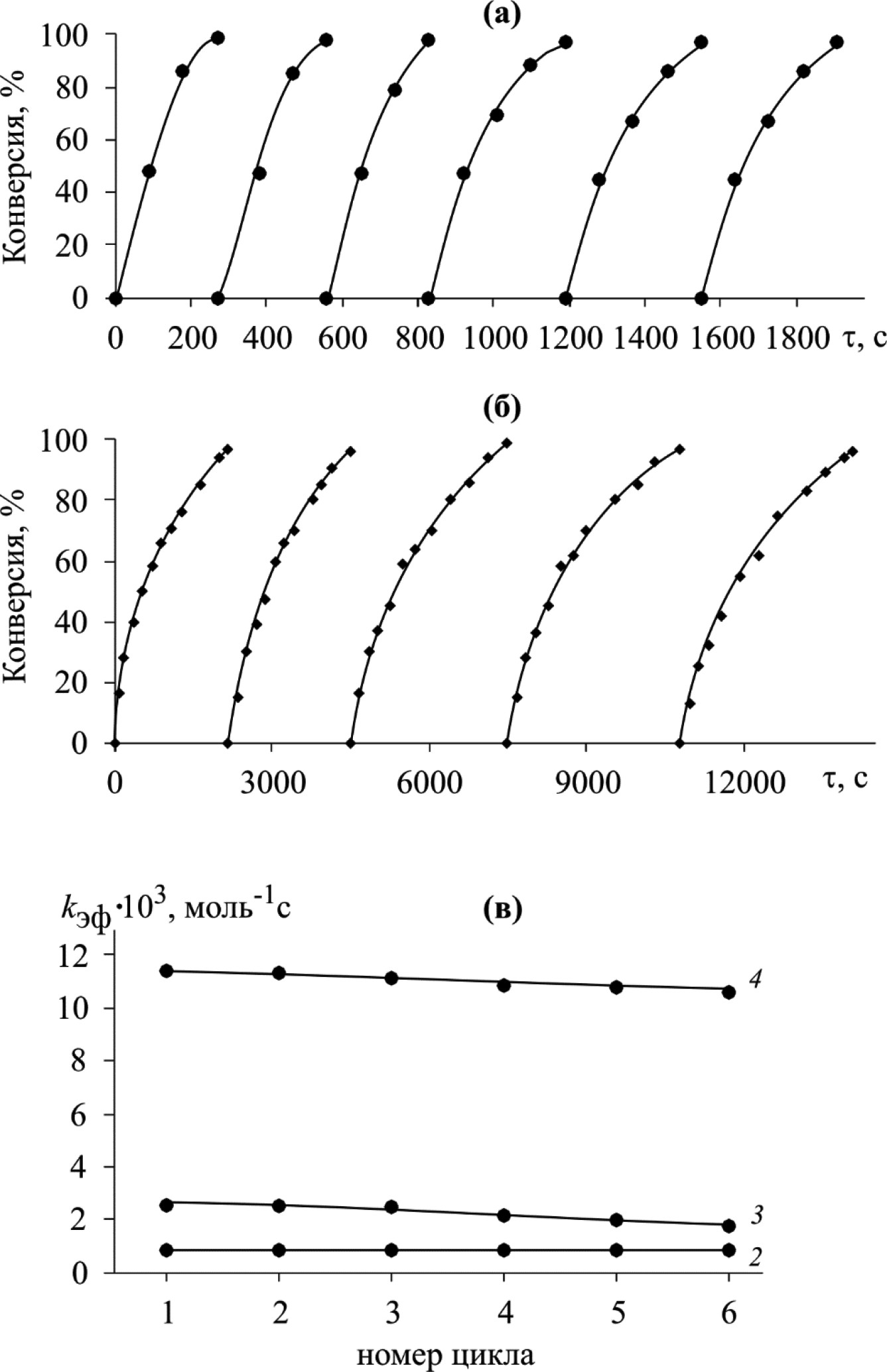 Рис. 8. Конверсия красителя (%) при периодическом его добавлении к активной форме комплекса 1: а – OrangeII (COrangeII = 8.64 × 10–4 моль/л) в присутствии формы 4; б – RB (CRB = 1.7 × 10–5 моль/л) в присутствии формы 3; в – изменение величины kэф при проведении шести циклов конверсии OrangeII с участием форм 2–4.