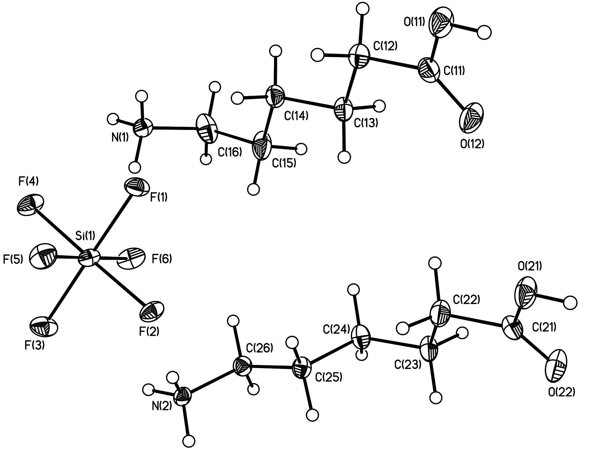 Синтез соединений. Соединение 1 получено добавлением к водному раствору Cpl (4.31 г, 0.0381 моль) 5 мл H2[SiF6] (мольное соотношение компонентов 2 : 1), реакционную смесь оставляли кристаллизоваться при комнатной температуре. Получившиеся бесцветные кристаллы (HOOC(CH2)5NH3)2SiF6 отделяли и высушивали на воздухе, выход 35%.