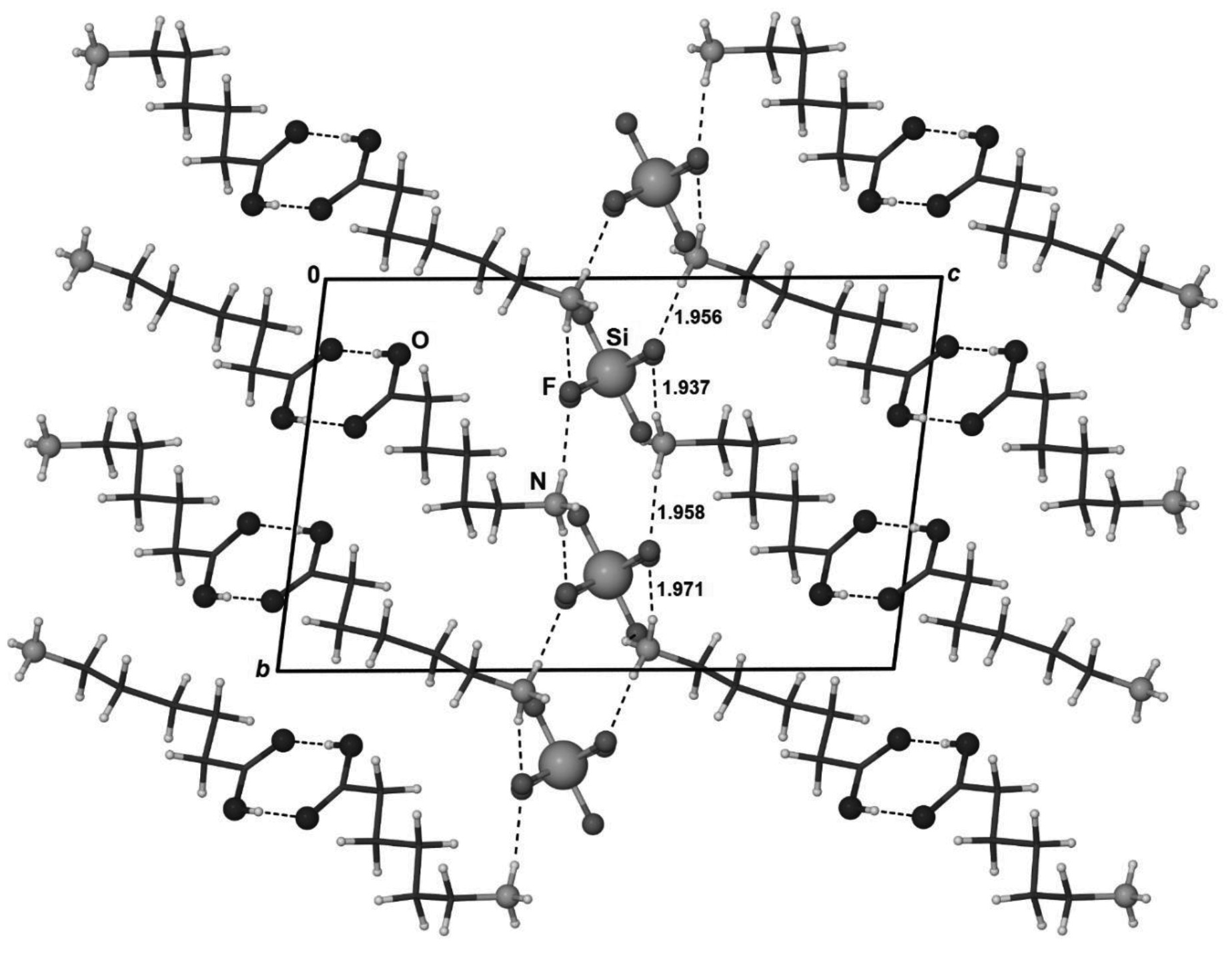 В независимой части ячейки соединения 1 представлены два катиона. Длины связей и углы в катионах 5-карбоксипентиламмония приведены в табл. 2. Проекция структуры на плоскость (100) дана на рис. 2. В структуре 1 между SiF62–-анионами и органическими катионами есть водородные связи F…Н–N (рис. 2, табл. 3). Кроме того, “кислые” водородные связи найдены между карбоксильными группами катионов 2.6547(19) и 2.6833(19) Å.