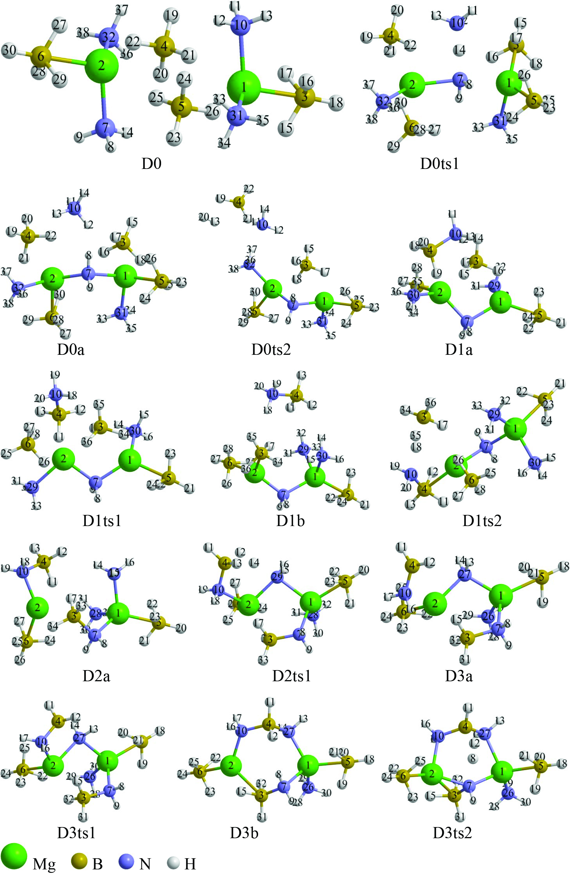 В наших предыдущих работах по моделированию отщепления водорода от комплексов борогидридов натрия и магния с водой и аммиаком было найдено, что олигомеризация таких комплексов ведет к снижению барьеров отрыва Н2 вследствие стабилизации промежуточных структур парой катионов [14‒16, 31]. Поэтому в данной работе на начальном этапе моделирования был применен димер [Mg(BH4)22NH3]2 (рис. 1, D0). Его энергия была использована в качестве начала отсчета при переходе к другим структурам, относительные энергии которых определяли следующим образом: