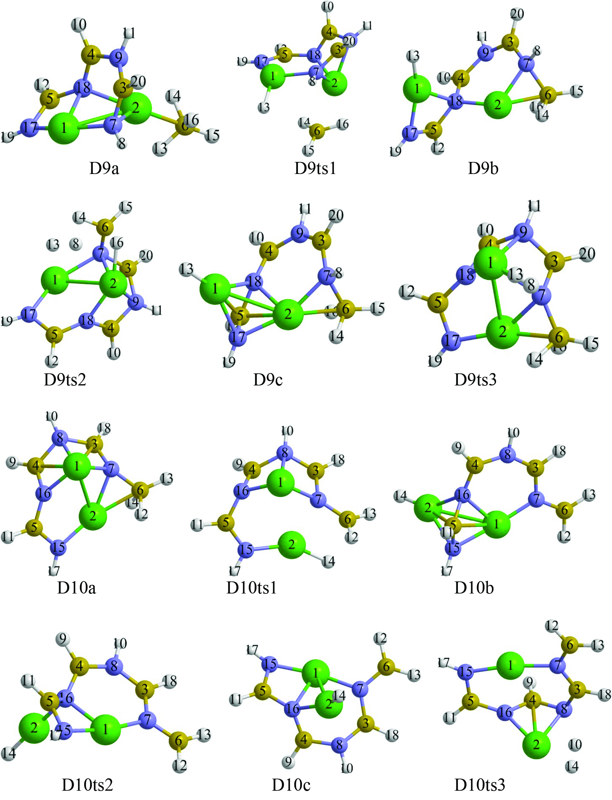 При обсуждении трансформации структур при отщеплении Н2 номера атомов, наиболее существенно участвующих в перестройке, указаны на рисунках в виде верхнего индекса.