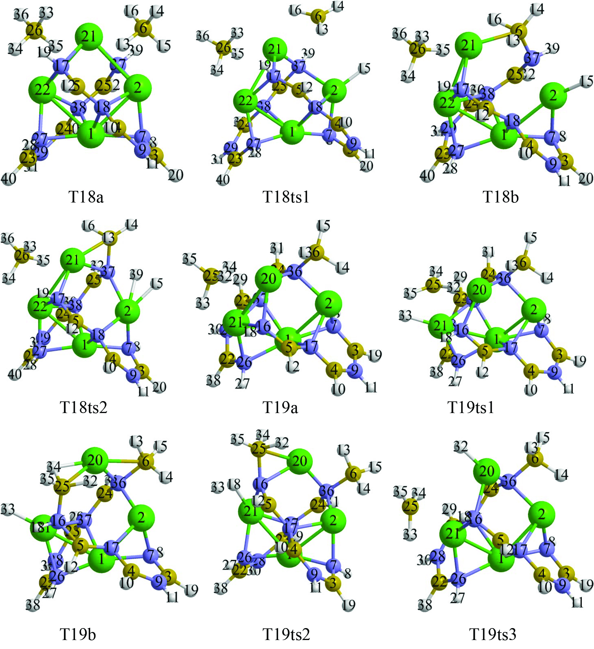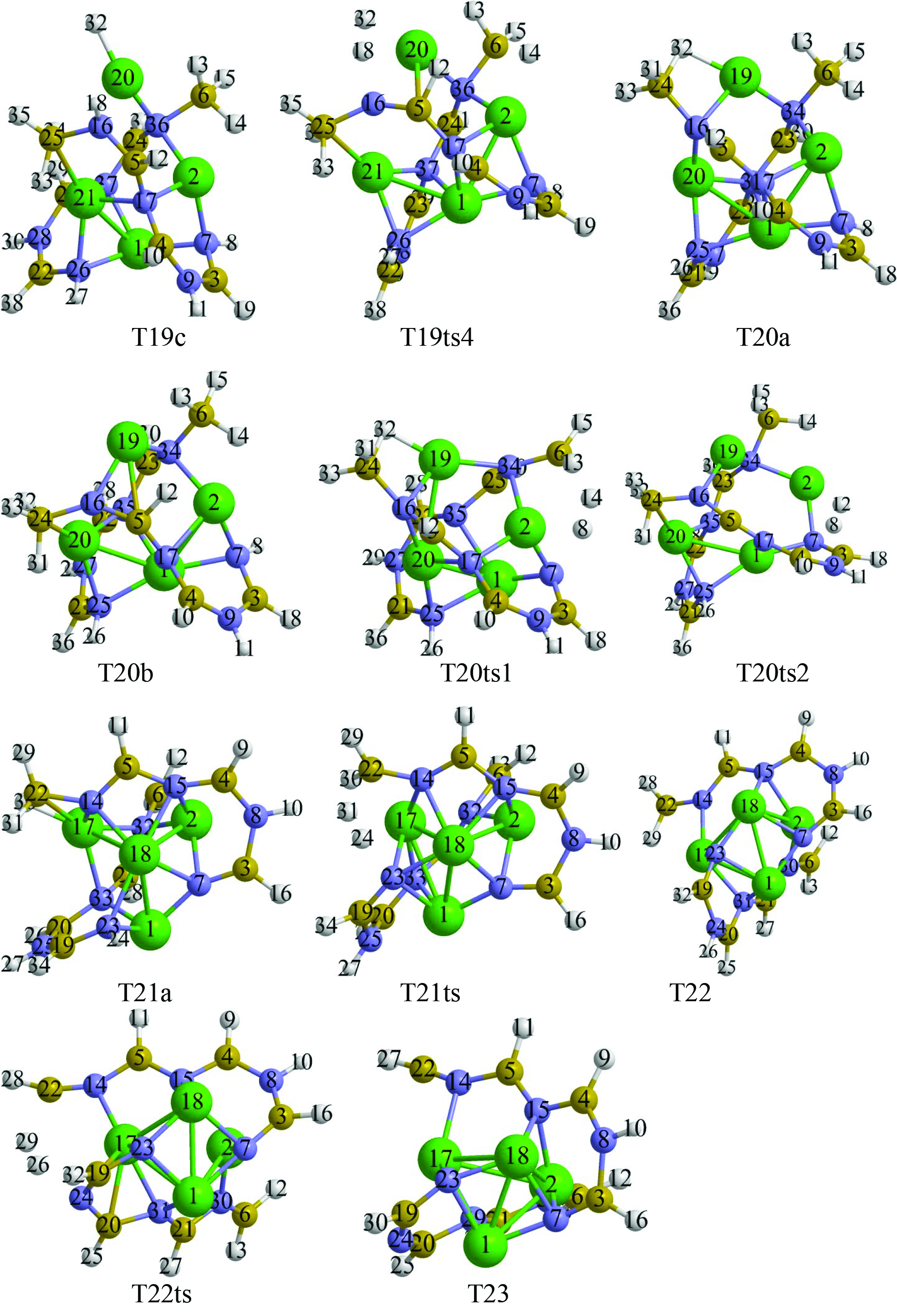 Механизм дегидрирования здесь оказывается примерно таким же, как в ряде рассмотренных ранее вариантов. На первом шаге анион Н‒ переходит из В6 на Mg2, фрагмент В6Н3 объединяется с N37H (T18ts1‒T18b), а затем связанные с N и Mg атомы Н15 и H39 формируют Н2 (T18ts2‒T19a). Аналогичным образом T19a трансформируется через T19ts1 в T19b с фрагментом Mg21H33, а далее в T20a через T19ts2 (рис. 7, 9). Кроме того, T19a может преобразовываться в T20b через T19ts3, T19с и T19ts4 (передача Н32 от В25Н4 на Mg2, формирование связи B25–N16 и отрыв Н18‒Н32). Далее T20a и T20b при отщеплении Н2 могут переходить в одну и ту же структуру T21a, а затем в T22 и T23 (рис. 7‒9). При этом наблюдается рост как величин барьеров, так и относительных энергий Гиббса промежуточных структур, сначала умеренный, а после T22 значительный.