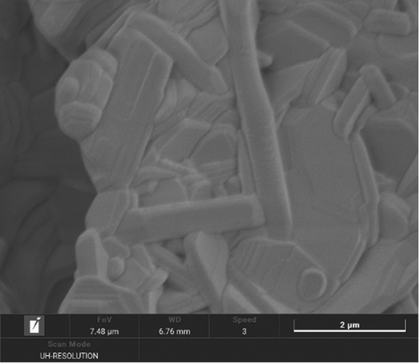 Анализ изображения поверхности образца, полученного методом растровой электронной микроскопии с использованием микроскопа TESCAN Amber (рис. 2), показал, что частицы гексаалюмината Mg-La имеют размер ˃200 нм, вследствие чего полученные в настоящей работе термодинамические величины не требуют коррекции за счет размерного фактора.