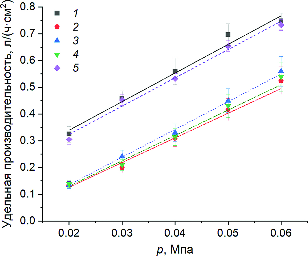 Рис. 3. Усредненная удельная производительность по воде исследуемых мембран: 1 – ТМ; 2 – ТМ + Ni-МОКС; 3 – ТМ/HNO3 + Ni-МОКС; 4 – ТМ/ПЭИ + + Ni-МОКС; 5 – ТМ + Хитозан + Ni-МОКС.