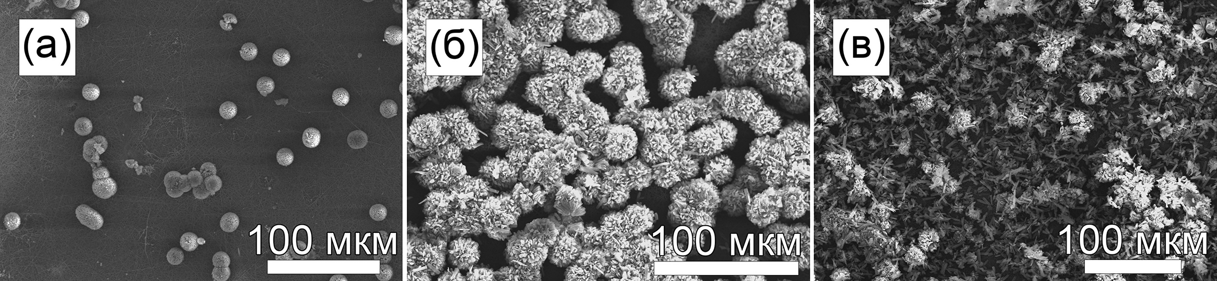 Частицы Ni-МОКС оказываются зафиксированными между нановолокнами (рис. 4б) и не перекрывают поры мембраны. На поверхности носителя ТМ + Хитозан сферические конгломераты Ni-МОКС отчетливо проявляются после 2 ч синтеза (рис. 5а). С увеличением времени синтеза увеличивается средний диаметр конгломератов (⁓15 мкм для 2 ч и ⁓25 мкм для 24 ч), которые в дальнейшем объединяются между собой (рис. 5б). Синтез в течение 48 ч приводит к отслаиванию Ni-МОКС от носителя (рис. 5в). При меньшем времени синтеза данный эффект не наблюдается.