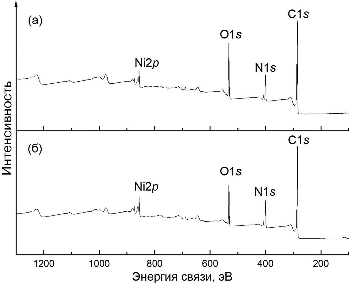 Элементный анализ порошка Ni-МОКС был выполнен на автоматическом CHN-анализаторе VarioMacroCube (Elementar). Элементный состав поверхности анализировали методом рентгеновской фотоэлектронной спектроскопии (РФЭС) на приборе ThermoFisher Scientific K-Alpha с использованием полусферического анализатора. Возбуждение фотоэлектронов проводили рентгеновским излучением алюминиевого анода (AlKα = 1486.6 эВ) при напряжении на трубке 12 кВ и токе эмиссии 3 мА. Положение пиков калибровали по стандартному пику С1s (285.0 эВ). Обзорные спектры регистрировали при окне пропускания 100 эВ с шагом 0.5 эВ. Регистрацию и обработку спектров проводили с помощью программы Avantage.