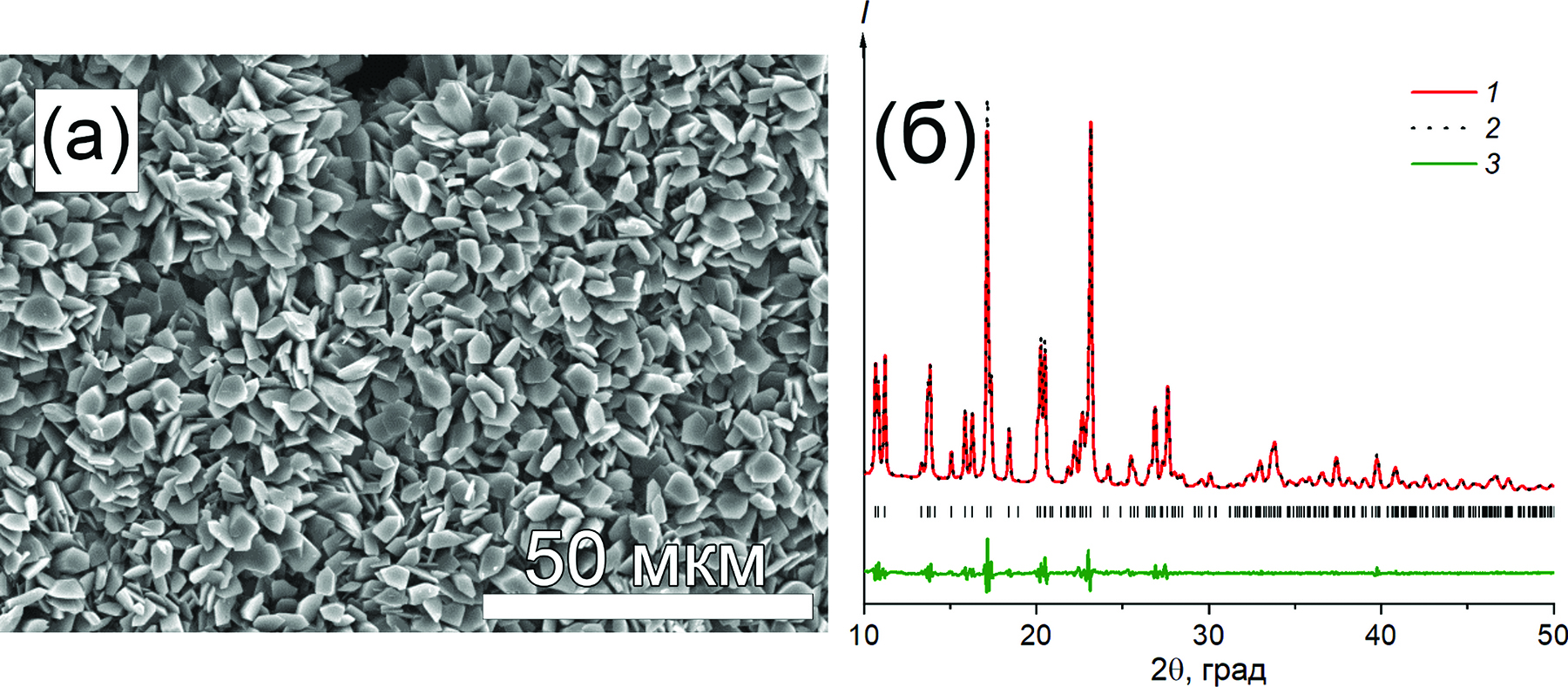 Рис. 9. а – Микрофотография порошка Ni-МОКС; б – рентгенограмма Ni-МОКС после уточнения методом Ритвельда. Rwp = 3.73, χ2 = 4.1: 1 – экспериментальная; 2 – расчетная; 3 – разностная.
