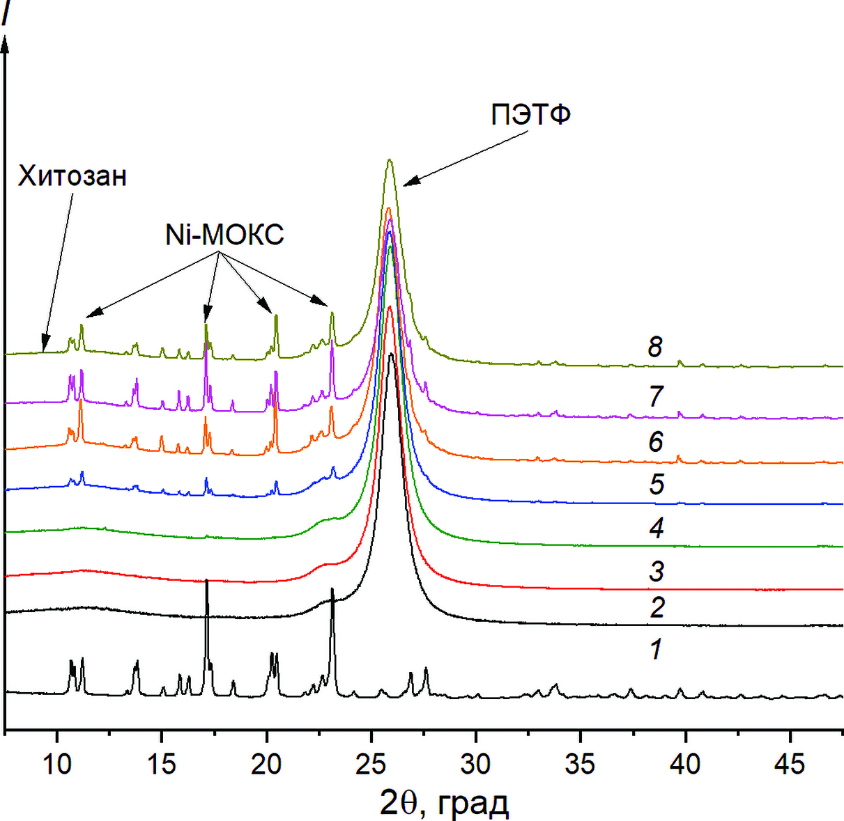 Рис. 10. Рентгенограммы образцов: 1 – порошок Ni-МОКС; 2 – ТМ + Хитозан; 3 – ТМ + Хитозан + Ni-МОКС, синтез 1 ч; 4 – ТМ + Хитозан + Ni-МОКС, синтез 2 ч; 5 – ТМ + Хитозан + Ni-МОКС, синтез 4 ч; 6 – ТМ + Хитозан + Ni-МОКС, синтез 8 ч; 7 – ТМ + Хитозан + Ni-МОКС, синтез 24 ч; 8 – ТМ + + Хитозан + Ni-МОКС, синтез 48 ч.