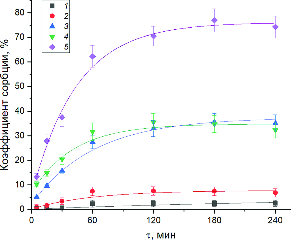 Рис. 12. Кинетика адсорбции ионов металлов: 1 – Ni-МОКС + Li+, 2 – Ni-МОКС + Mg2+, 3 – Ni-МОКС + + Zn2+, 4 – Ni-МОКС + Ag+, 5 – Ni-МОКС + Cd2+.