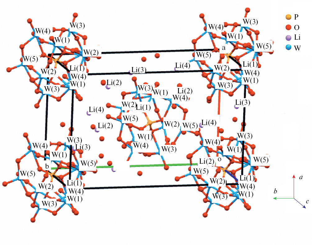 На рис. 1 представлена кристаллическая структура литийвольфрамофосфата Li7[γ-PW10O36] · 7H2O (1). Гетерополианион находится на двойной кристаллографической оси и ограничен с обоих концов катионом Li+(1). Из рисунка видно, что в элементарную ячейку входят две молекулы гетерополианиона 1, включающие литиевый катион Li+(1). Его асимметричная часть составляет половину аниона. В асимметричную часть структуры входят атом P, который находится на оси второго порядка, пять атомов W в общем положении, атом Li(1) находится на оси второго порядка, остальные атомы – Li(2), Li(3), Li(4) – в общем положении. На рисунке видны также атомы O, находящиеся в общем положении, а также четыре молекулы H2O, три из которых находятся в общем положении, а одна – в частном. Основные длины связей приведены в табл. 3. Длины связей P–O мало отличаются: P–O(1) 1.536 Å, P–O(2) 1.569 Å, а расстояния W–O изменяются значительно: W(1)–O(1) 2.393 Å, а W(5)–O(17) 1.717 Å.
