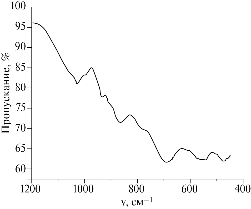 В ИК-спектре комплекса (рис. 3) присутствуют следующие асимметричные частоты колебаний (νaс, см–1): (P–O) 1027, 994 (плечо), (W = O) 935, 910 (плечо), (W–O–W)угл 865, 783 (плечо), (W–O–W)конц 689, (Со–О) 556, (Со–О–Со) 476, а также νас(OH) 3000–3600, δ(OH) 1600–1650, принадлежащие молекулам H2O (на рисунке не показаны).