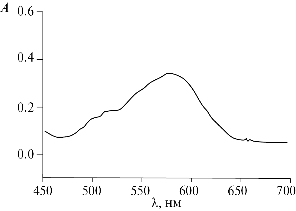Рис. 4. Электронный спектр поглощения комплекса Li7[Co4(H2O)2 · (γ-PW10O36)2] · 36H2O (500 мкмоль) при λ = 580 нм в 0.1 М натрий-фосфатном буферном растворе, рН 8, толщина кюветы l = 1 см