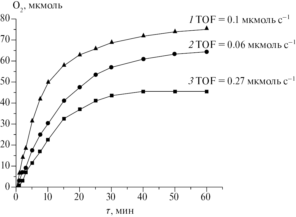 Четырехъядерный комплекс кобальта Li7[Co4(H2O)2(γ-PW10O36)2] · 36H2O (Li7Co4) (2) оказался не только стабильным, но и активным гомогенным катализатором реакции фотохимического окисления воды с образованием O2 в присутствии акцептора электронов Na2S2O8 и фотосенсибилизатора (bpy)3RuCl2 при облучении видимым светом (λ = 450 нм). На рис. 6 приведены кинетические кривые выделения O2 в присутствии разных катализаторов и противокатионов. На эффективность катализатора влияют как природа переходного металла и его лигандное окружение, так и противокатионы. Кинетика реакции образования кислорода, катализируемая 4-ядерным комплексом рутения с Rb+ – противокатионом Rb8K2[{Ru4(μ-O)4(μ-OH)2(H2O)4}(γ-SiW10O36)2] · 25H2O (Rb8Ru4) (кривая 3), прекращается через ~30 мин, т.е. происходит разрушение катализатора с образованием оксосоединения рутения в более высокой степени окисления (Ru4O8), которое быстро превращается в RuO2, оседающий на стенках реактора в виде черни, что не наблюдали на катализаторах с Li+-противокатионами (кривые 1, 2). На литиевых катализаторах (кривые 1, 2) кислород продолжает выделяться, но с меньшей скоростью, т.е. Li+-катион стабилизирует тетрарутениевое и тетракобальтовое ядра. Из рис. 6 видно, что скорость образования O2 на катализаторе Li7Co4 выше (частота оборотов катализатора за секунду TOF = 0.1 мкмоль/с) по сравнению с рутениевыми катализаторами (0.06 и 0.027 мкмоль/с соответственно). В табл. 4 продемонстрирована активность катализаторов.
