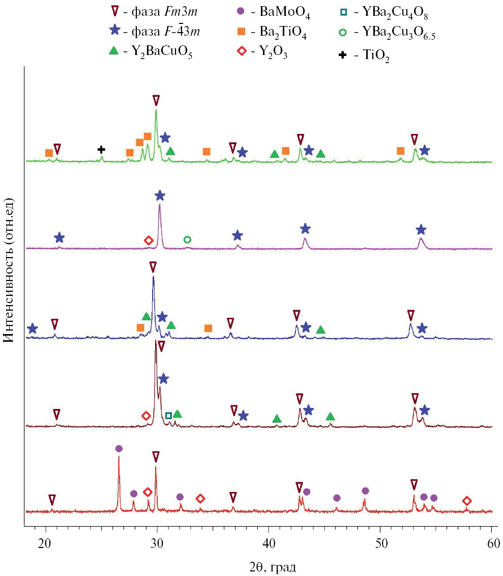 Образцы системы Ba2Y2O5–BaCuO2–BaMoO4–BaTiO3 синтезировали методом сжигания геля, в качестве исходных реагентов использовали BaO (ч., ТУ 6-09-5397-88), Y2(CO3)3 · 3H2O (х. ч., ТУ 6-09-4770-79), CuO (ос. ч., ТУ 6-09-3098-73), MoO3 (ч. д. а., ТУ 6-09-4471-77), тетрабутилат титана (C4H9O)4Ti (техн., ТУ 6-09-2738-89) и азотную кислоту (ч. д. а., ГОСТ 4461-77), разбавленную водой в соотношении 1 : 1 (об.). Оксиды металлов и кристаллогидрат карбоната иттрия растворяли в азотной кислоте и к полученному раствору добавляли по каплям тетрабутилат титана. Далее реакционную смесь упаривали до образования геля, который после кратковременного возгорания превращался в серо-черный порошок, который перетирали, переносили в керамический тигель, отжигали при 1000°C в течение 3 ч и охлаждали в инерционно-термическом режиме, не вынимая из печи [23, 24].