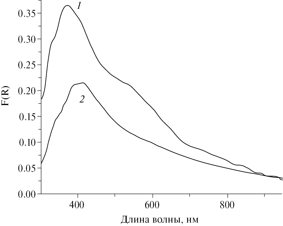 Спектры диффузного отражения в диапазоне 200–1000 нм регистрировали с помощью модульной оптической системы Ocean Optics (дейтериево-галогеновый источник DH-2000-BAL, интегрирующая сфера ISP-80-8-R диаметром 80 мм, детектор QE650000). В качестве образца сравнения использовали стандарт WS-1 (Ocean Optics) из политетрафторэтилена.
