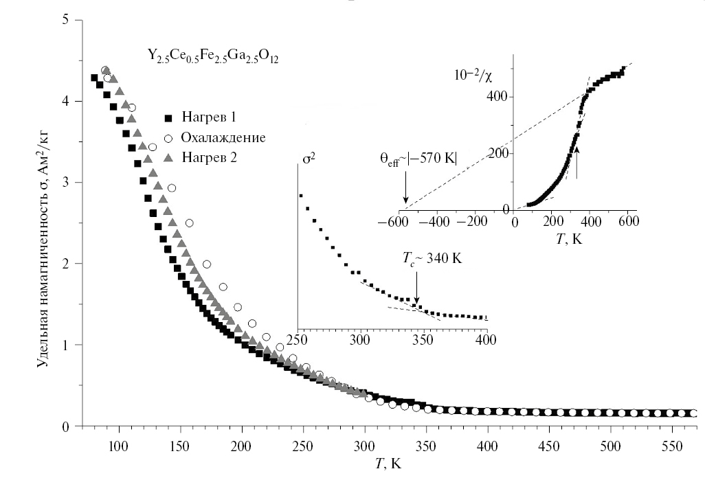 Авторами настоящей работы ранее синтезирован гомогенный порошкообразный феррогранат Y2.5Ce0.5Fe2.5Ga2.5O12 с содержанием церия 16.7% [17–19]. Такое рекордное содержание Сe3+ в материале получено отжигом Y2.5Ce0.5Fe2.5Ga2.5O12 в вакууме и заменой части ионов железа Fe3+ на Ga3+. В то же время в литературе отсутствуют сведения о магнитных характеристиках церийзамещенных феррогранатов.