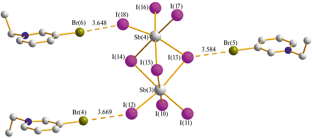 Комплекс 1 был получен в смеси растворителей ацетонитрил/ацетон, в то время как в синтезе 2 использовали только ацетонитрил. Соединение 1 кристаллизуется в моноклинной сингонии. Независимая часть ячейки содержит два фрагмента {Sb2I9} и шесть катионов. Фрагмент {Sb2I9} сформирован двумя октаэдрами {SbI6}, имеющими общую грань. Расстояния Sb–Iтерм составляют 2.8461(7)–2.8802(8) Å, Sb–Iμ2 — 3.2046(7)–3.3166(7) Å. Фрагменты {Sb2I9} связаны с тремя катионами (рис. 1) нековалентными контактами Br···I, которые заметно меньше суммы ван-дер-ваальсовых радиусов данных атомов (3.81 Å [31]). Эти контакты можно классифицировать как галогенную связь [32–39] первого (Br(4)···I(12) 3.6694(11) Å и Br(6)···I(18), 3.6478(11) Å) и второго типа (3.5835(9) Å, Br(5)···I(13)). Вывод о типе галогенного контакта сделан на основании сравнения соответствующих углов при данных атомах, например, для Br(6)···I(18) углы равны 152.77° (Sb(4)–I(1)···Br(2)) и 167.74° (C37)–Br(6)···I(18)), что позволяет отнести это взаимодействие к первому типу.