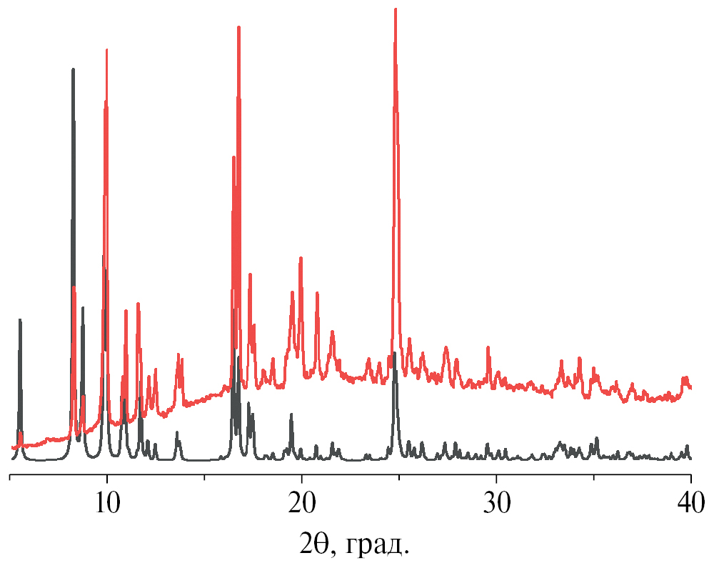 Рис. 1. Экспериментальная (красная) и рассчитанная на основе данных РСА (черная) дифрактограммы для 1.