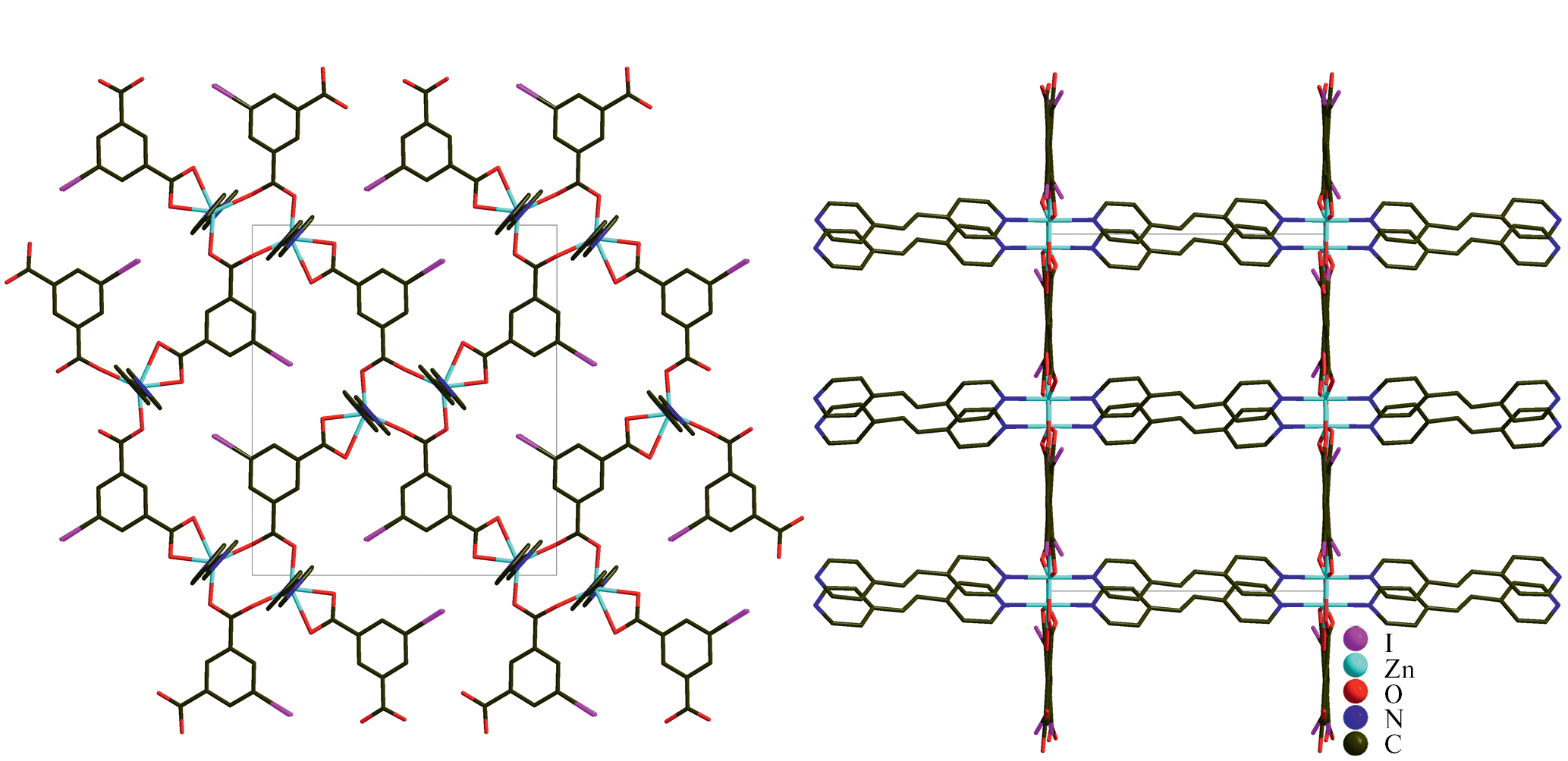 [Zn2(2-I-bdc)2bpen]n (1) and [Zn(I-ipa)bpen]n (2) are two new metal-organic frameworks based on zinc, 2-iodoterephthalate (2-I-bdc), 5-iodisophthalate (5-I-ipa), and 1,2-bis(4-pyridyl)ethylene (bpen). Using single-crystal X-ray diffraction, crystal structures of 1 and 2 were determined.