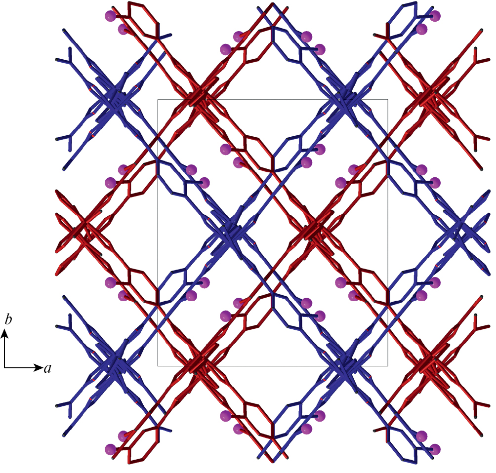Рис. 5. Фрагмент упаковки МОКП 1 с взаимопроросшими каркасами, показанными синим и красным цветом. Атомы I пурпурного цвета.