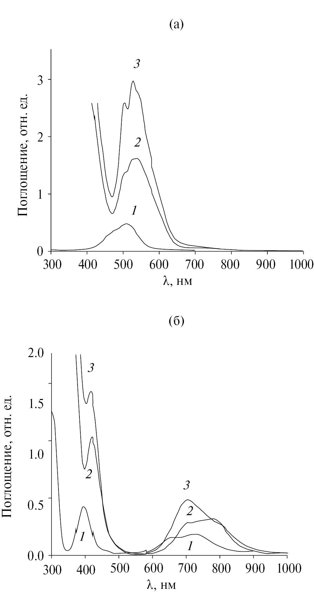 Рис. 2. Электронные спектры поглощения растворов комплексов кобальта (а): 1 – CoCl2 ∙ 6H2O 0.1 моль/л; 2 – Na5[PW11O39Co(H2O)] ∙ 14H2O 0.03 моль/л; 3 – Na5[PW11O39Co(ГМТА)] ∙ 13H2O 0.03 моль/л и комплексов никеля (б): 1 – Ni(NO3)2 ∙ 6H2O 0.1 моль/л; 2 – Na5[PW11O39Ni(H2O)] ∙ 14H2O 0.03 моль/л; 3 – Na5[PW11O39Ni(ГМТА)] ∙ 13H2O 0.03 моль/л.