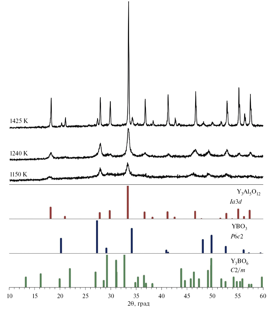 Рис. 3. Рентгенограммы образцов стеклокерамики после отжига при 1150, 1240 и 1425 K. Приведенные штрихдиаграммы соответствуют Y3BO6 (ISCD 84966), YBO3 (ISCD 100015) и Y3Al5O12 (ISCD 067103)